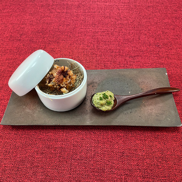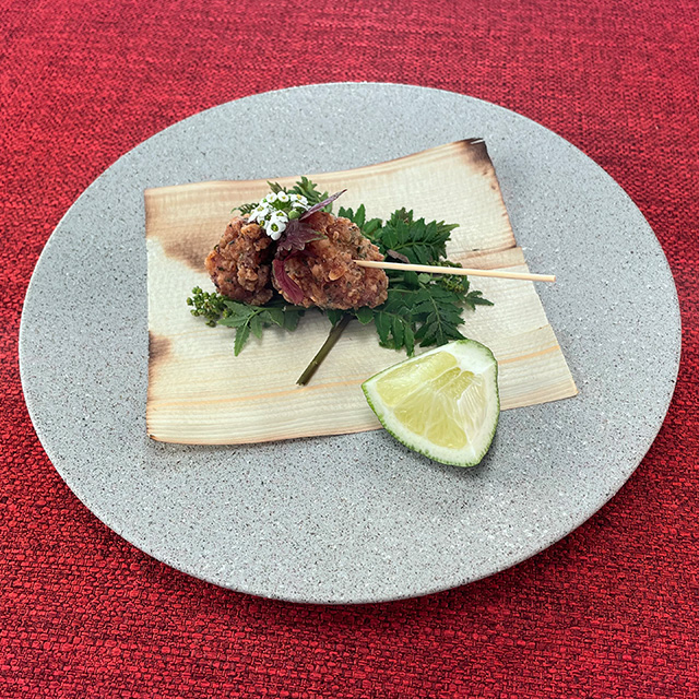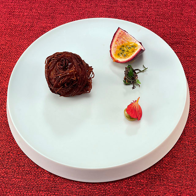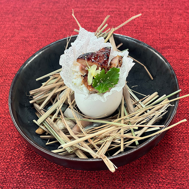 熊谷シェフが作り上げたのは、これまでにないまったく新しいスタイルの“親子丼”。ライスペーパーを器に見立てて、器ごと一口で食べることのできる斬新な親子丼。
