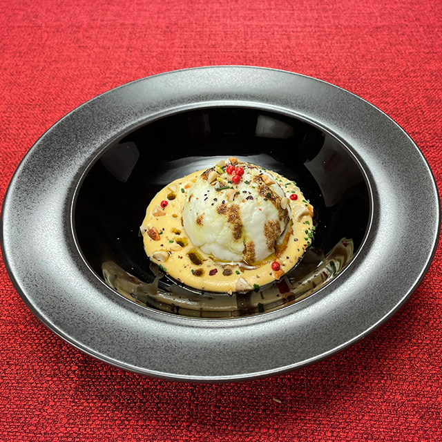 柴田シェフはフランス料理のデザート「ウフ・ア・ラ・ネージュ」をモチーフにした斬新な卵料理。瀬川氏は「卵の殻を使うなど、サステナビリティもあって、時代の潮流に合っているお料理で、印象的」と評価。堀江氏も「繊細で、色んな触感や複雑味が混ざっている。奥さん(のアドバイスもあったと聞いたので)と二人三脚で少しずるいかな(笑)」と大きくうなずく。