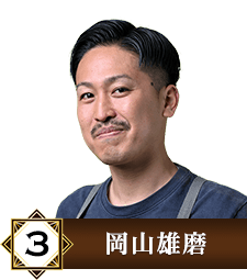 岡山シェフは、卵を使ってペルー料理のセビーチェに仕上げた。試食に参加した屋敷(ニューヨーク)は「めっちゃ旨い!酸っぱいとか甘いとかいっぱい合体してめっちゃうまい味になってる!」とその複雑な味わいを表現。堀江氏も「酸味、辛味、全体的にいい料理」と語るが「見たことある卵料理」という厳しい評価も加えた。