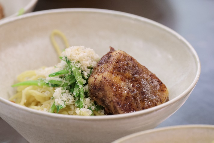その吉岡が打ち出したのはラーメン、発酵食品、乳製品の相性のよさを活かした革命ラーメン。使われている鯖の糠漬け、へしこは郷里のものだ。芳醇な香りと旨みのあるへしこのぬかと、クリ-ミーさと酸味を併せ持つヨーグルトはどんな味わいを生むのか。上沼恵美子審査員からは「大好き! あとを引きますね」のコメントが。果たして結果は!?
